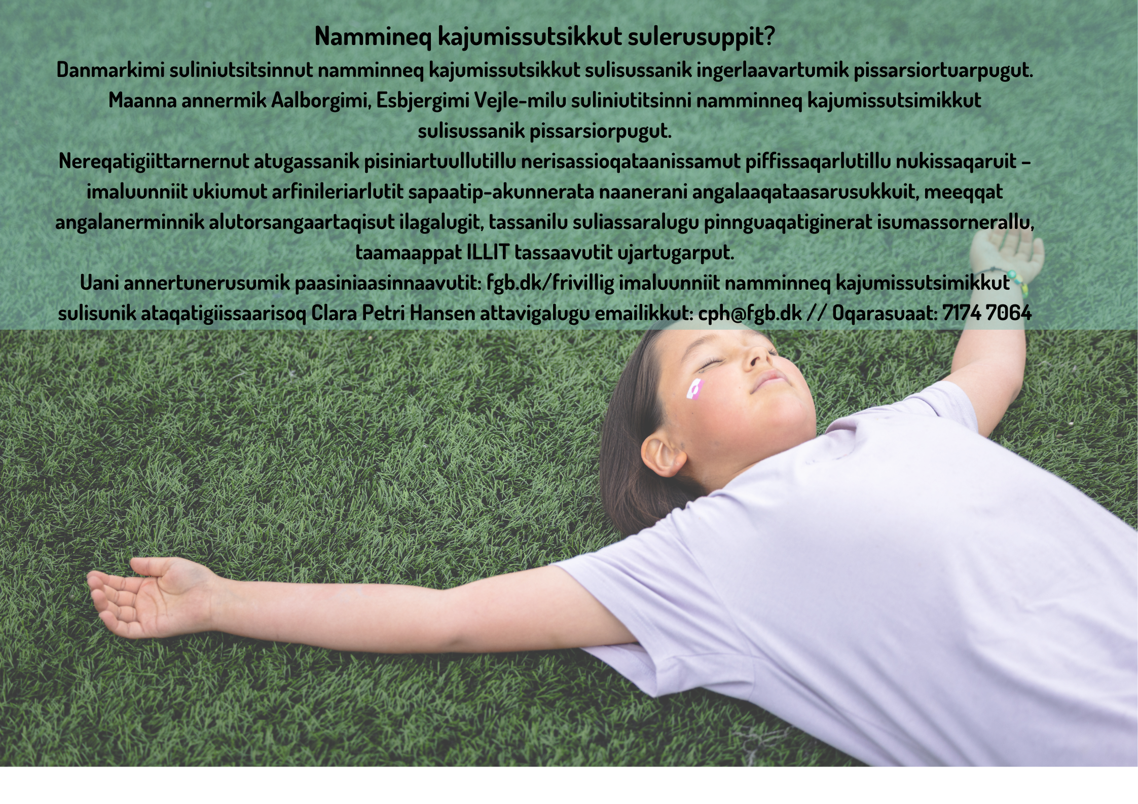 Tamanna tassaavoq Kalaallit Meerartaanni nammineq kajumissuseq naapertorlugu suliap qanoq ittuusinnaaneranut assersuutissatsialak. Inerneriivaa meeqqanut ilaqutariinnullu naleqarluartumik sunniuteqarnera, tamannalu tassaavoq suliat tamarmik siunertaat,” Clara naggasiivoq.